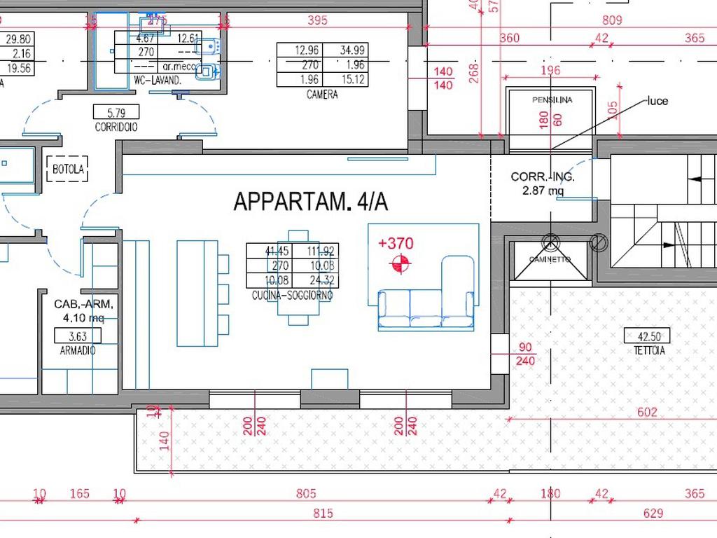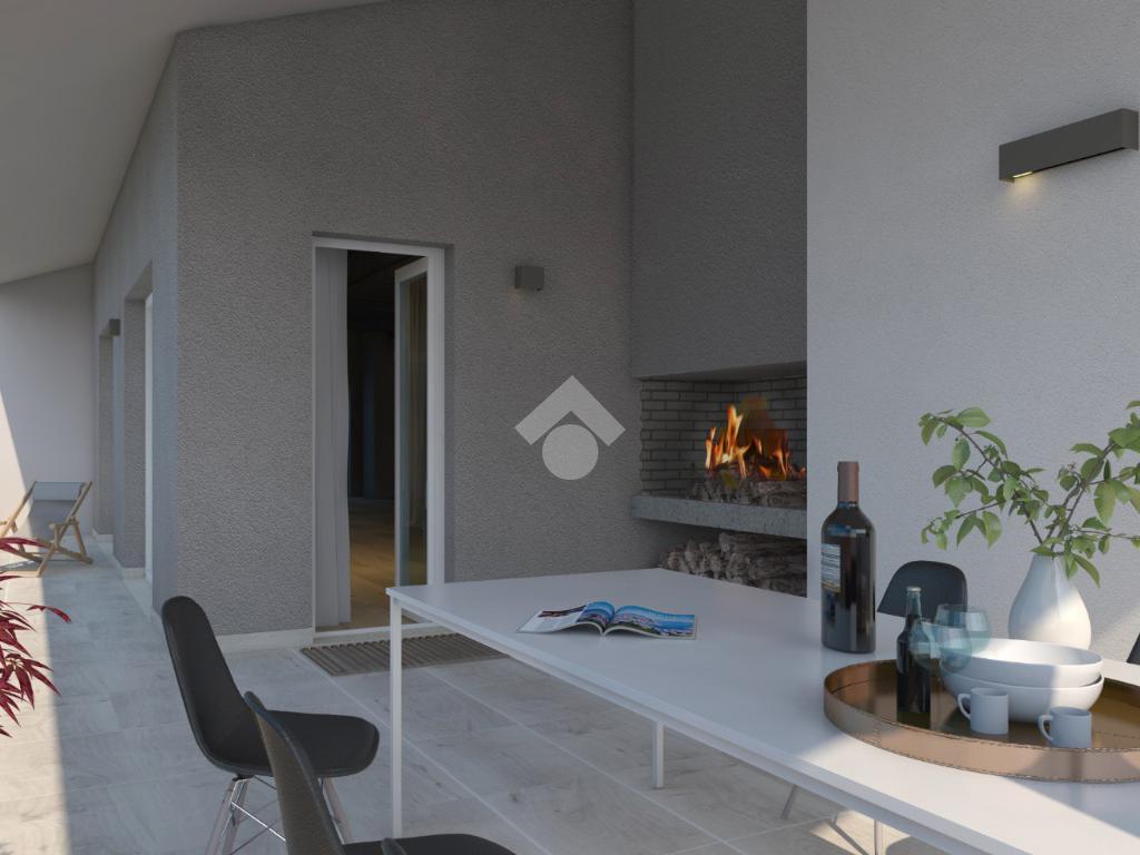 Ampio soggiorno open-space di 42 mq con accesso a terrazzo coperto di pari metratura, dotato di caminetto, perfetto per pranzi e cene all’aperto.