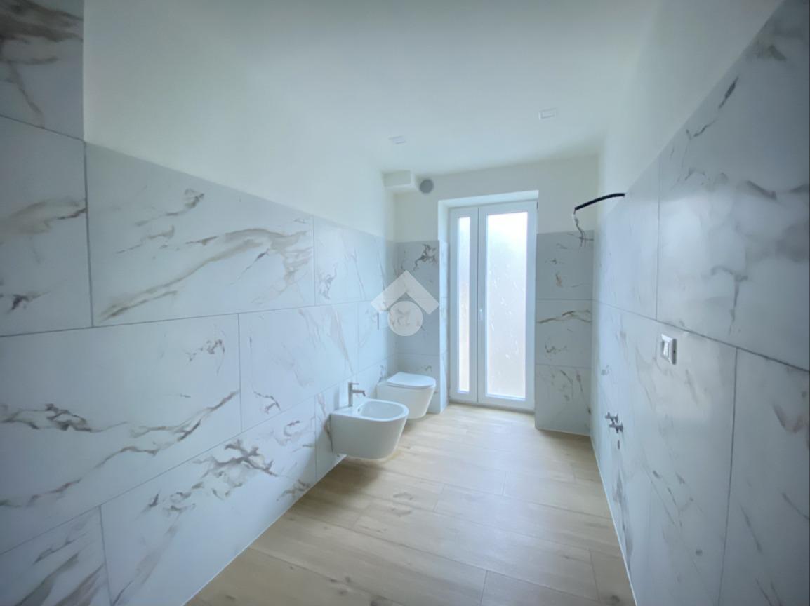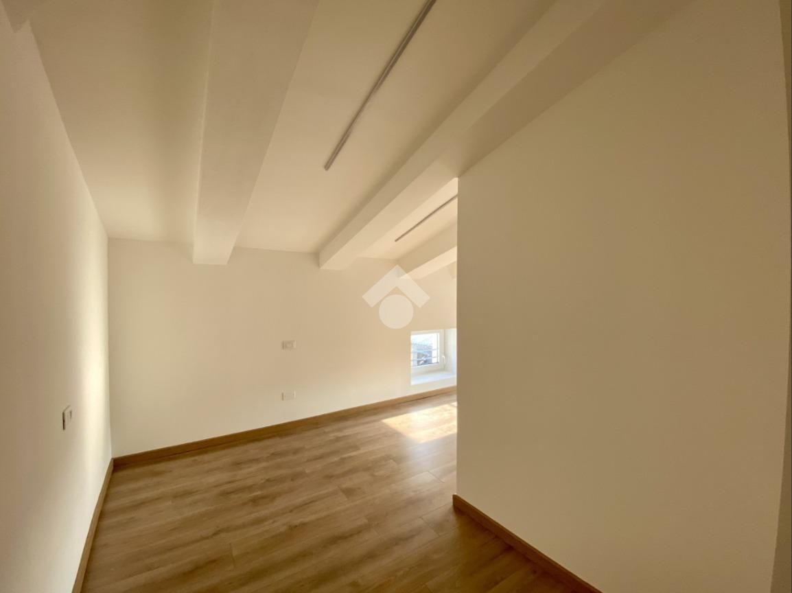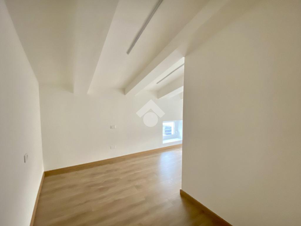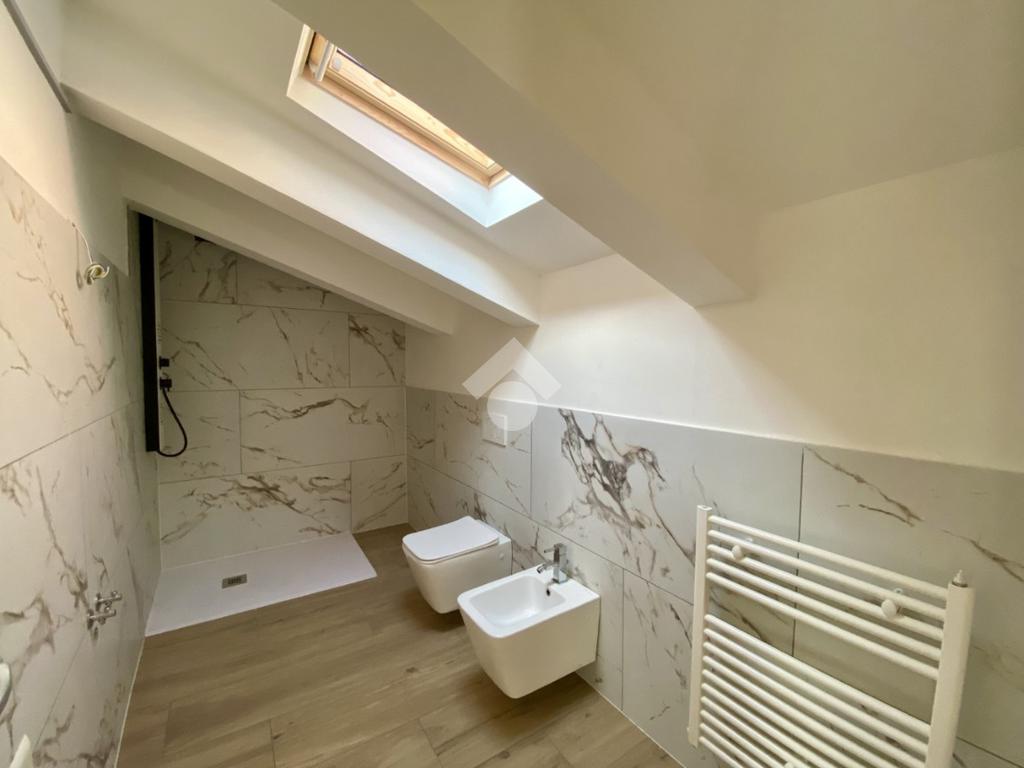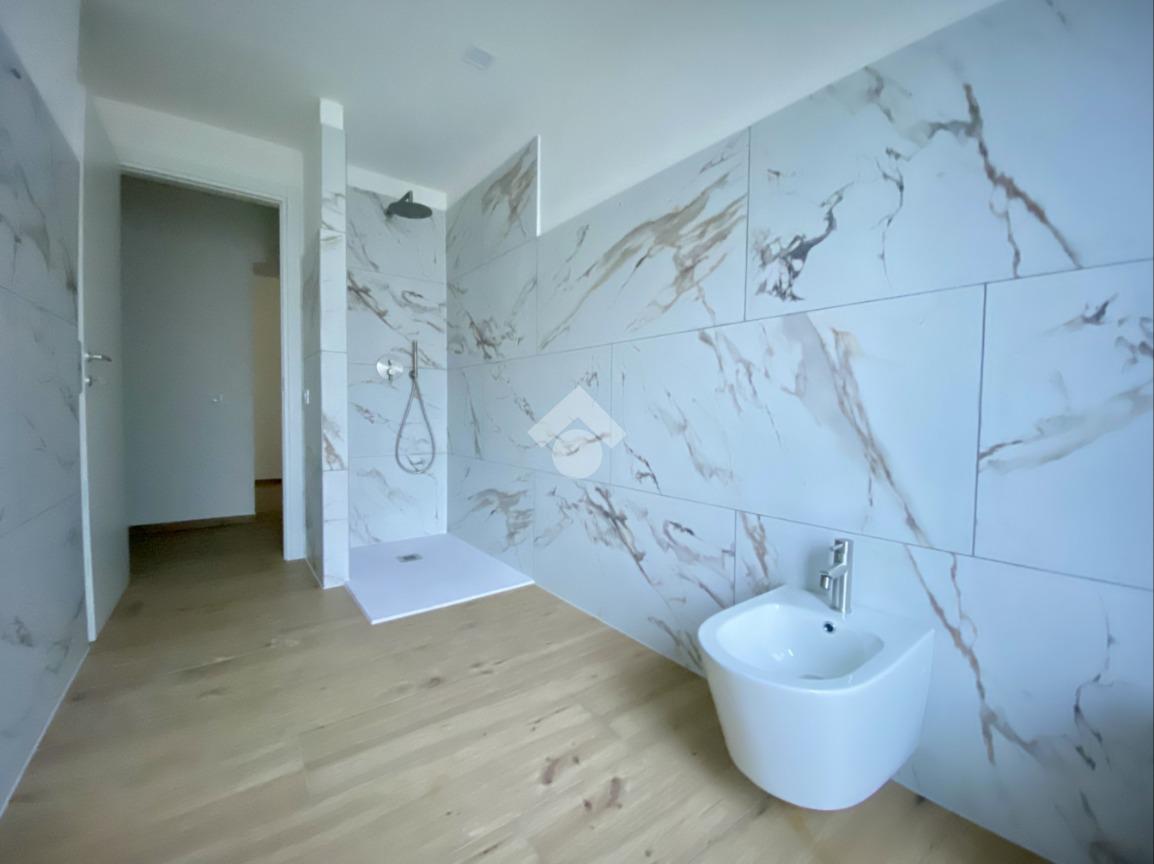 Sempre sul piano, un pratico antibagno separa la zona lavanderia (con caldaia e attacchi lavatrice) da un bagno finestrato dal design contemporaneo, completo di doccia walk-in, sanitari sospesi e raffinate finiture in gres effetto marmo. A servizio del bagno, un secondo terrazzo.